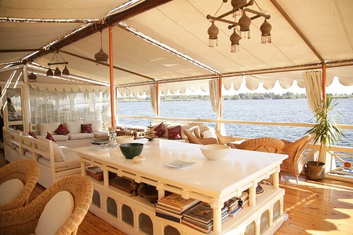 Dahabya Saraya El-Nile, your intimate vessel for an unforgettable 8 days and 7 nights sailing the Nile from Luxor to Aswan. Unlike larger ships restricted to main channels, the Dahabya Saraya El-Nile navigates hidden coves, allowing access to smaller temples and villages untouched by mass tourism. The dahabiya's traditional charm fosters a serene atmosphere. Picture yourself lounging on the sundeck, lulled by the gentle rhythm of the Nile and captivated by the ever-changing desert landscapes. Savor authentic Egyptian meals prepared onboard, a delightful fusion of relaxation and cultural immersion. A Journey Through Time: Explore Luxor's majestic temples, Esna, Edfu, Kom Ombo, and Aswan. Each day brings a new chapter in Egypt's captivating story, ensuring an unforgettable adventure. This dahabiya cruise transcends sightseeing.