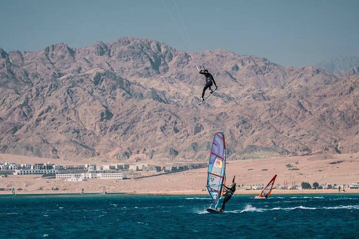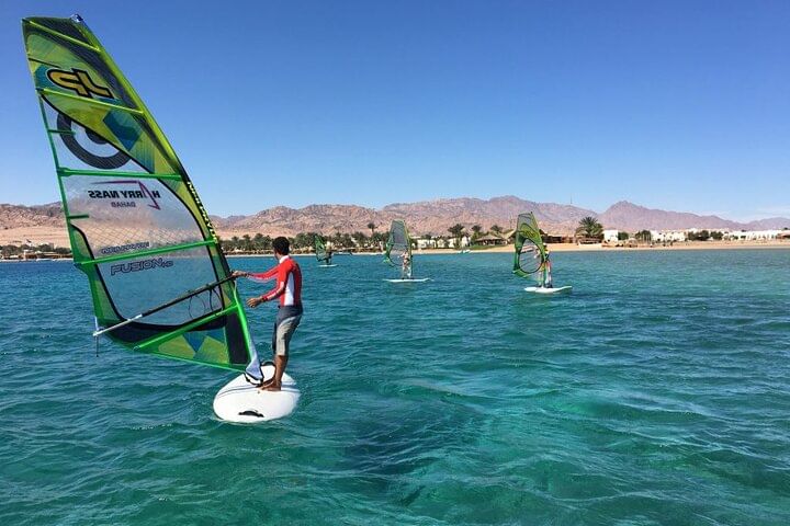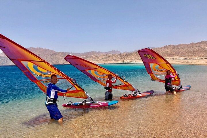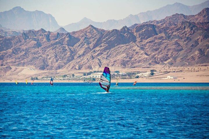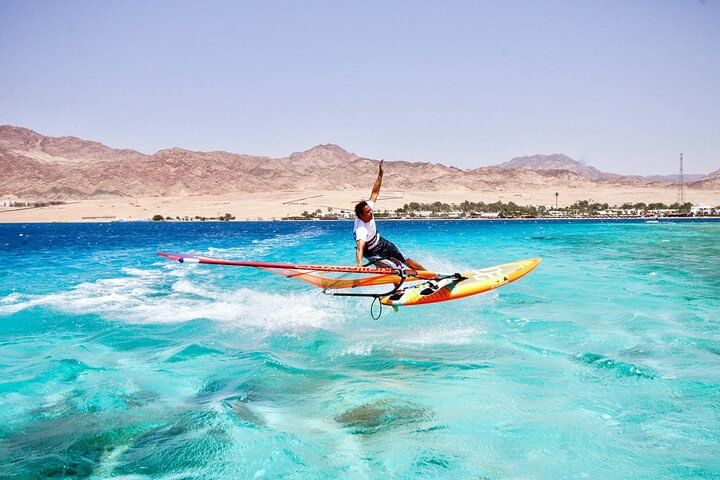 Experience the unique thrill of windsurfing on the clear waters of the Red Sea in Dahab. What sets this adventure apart is its inclusivity, catering to all levels of expertise, from beginners to seasoned windsurfers. Whether you're just starting or an experienced enthusiast, the Red Sea's gentle breezes and inviting waves offer the perfect environment for an exhilarating windsurfing experience.